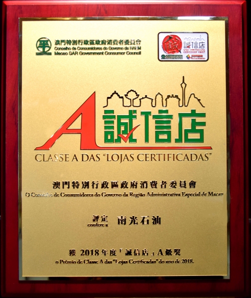 2018年12月5日,特区政府消费者委员会公布2018年度“诚信店”评核成绩,逾千商户获诚信店优质标志,南光石油等13间商号获评特优成为A级“诚信店”。