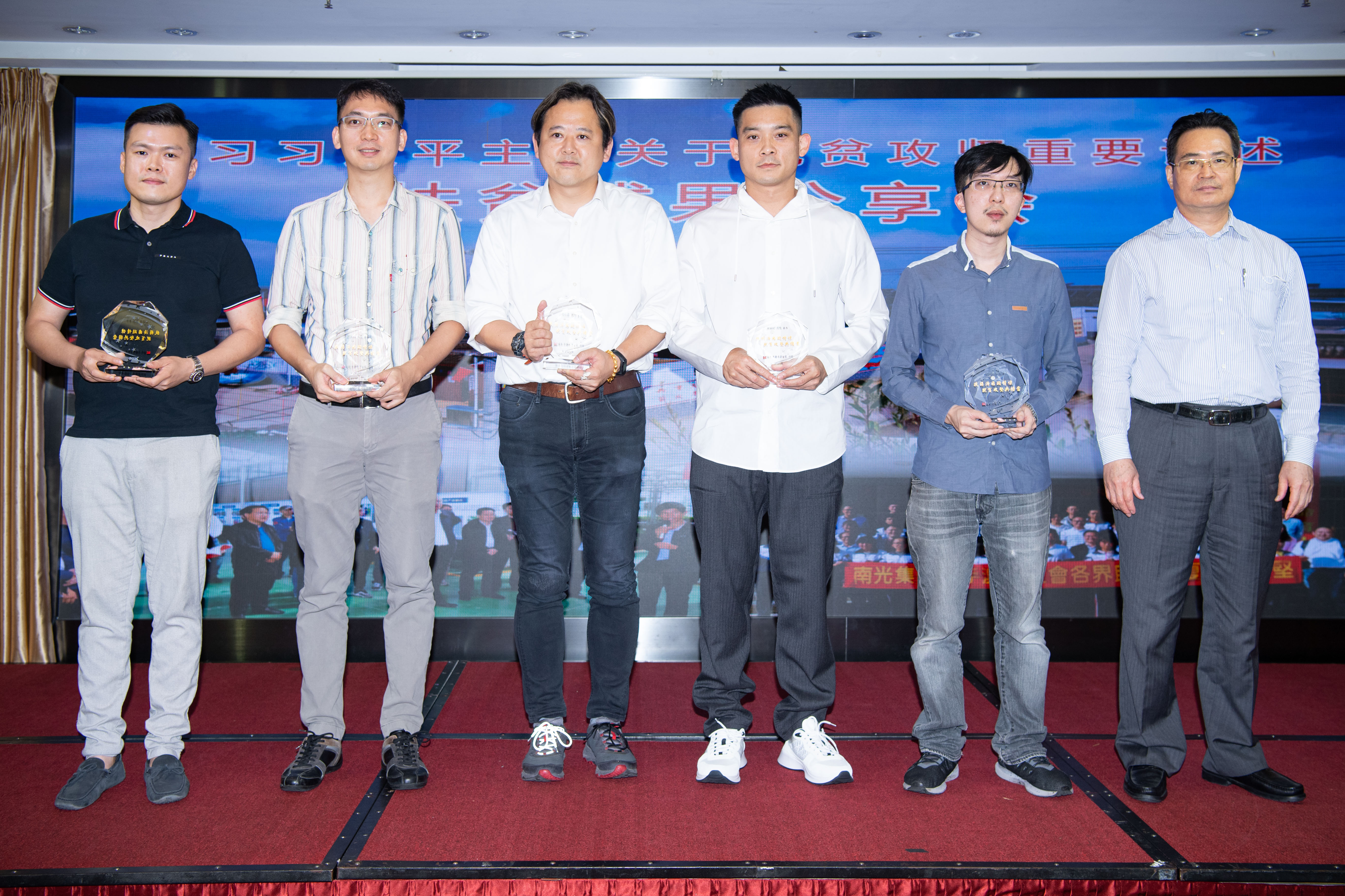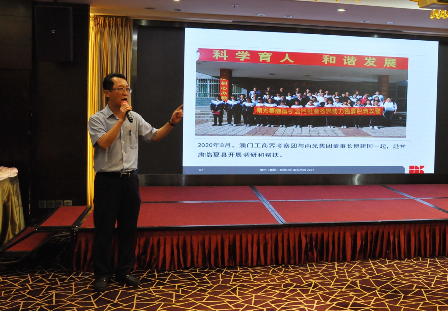 5月31日,南光集团举办学习习近平主席关于脱贫攻坚的重要论述暨扶贫成果分享会。澳门中联办经济部孙耀华,全国人大代表刘艺良,全国政协委员李佳鸣,澳门立法会议员麦瑞权,镜湖慈善会常务副主席冯志强,同善堂值理李俊鸣,澳门街坊总会副会长萧东文,以及20余家澳门商会、社团、企业代表出席会议。集团董事长傅建国出席并讲话,集团副总经理罗群代表南光集团致欢迎辞,集团常务董事陈质颖、集团副总经理张沛然等领导向参与定点帮扶工作的澳门各界代表颁发脱贫攻坚纪念座,集团有关单位负责人和扶贫干部参加会议,共同学习习近平主席关于脱贫攻坚的重要论述、分享全国脱贫攻坚全面胜利的喜悦、回顾各自亲身参与扶贫事业的难忘经历、展望乡村振兴的美好前景。
