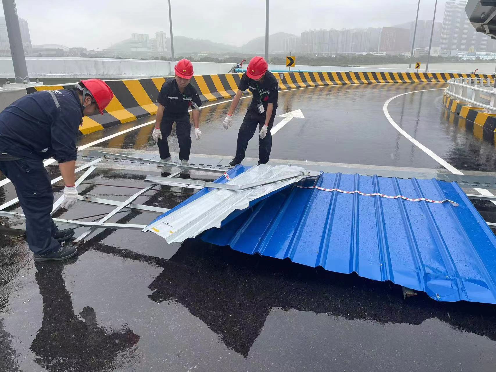 图为澳门大学通道桥项目部进行桥面清障工作。