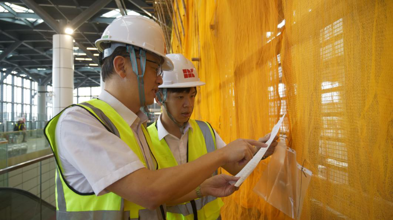 南光置业轻轨项目管理人员在莲花站检查防雨卷帘后加工程,在确保工程质量的前提下,全力以赴保障项目如期建成投用。