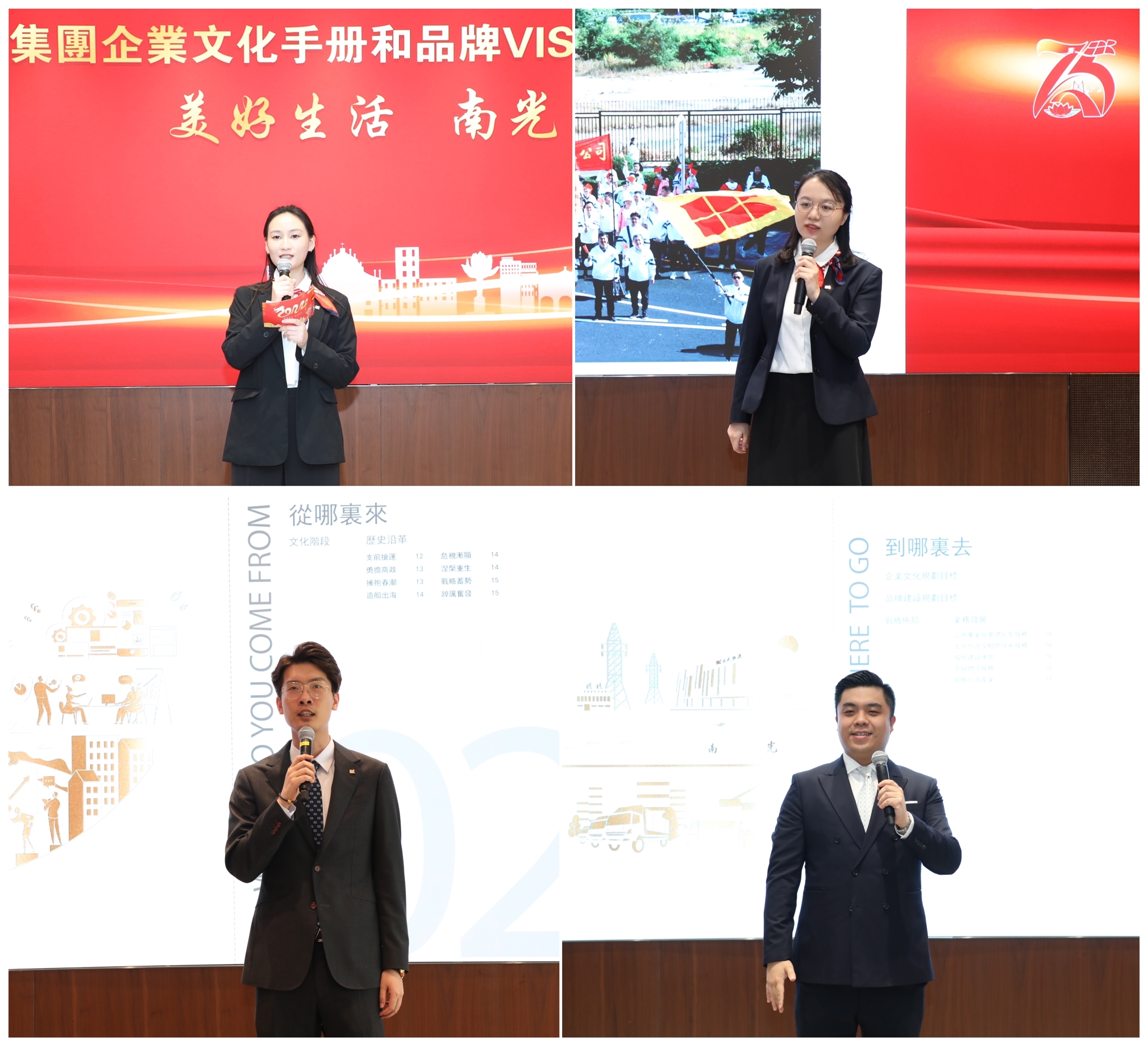 首批南光文化品牌青年宣讲官南光石油黄麟涵、南光澳中旅王硕、南光置业雷美玉、南光物流梁艺琳、南光文创王丹、南光澳巴陈玉仪及集团社会工作部张婧雯、欧阳铭聪上台亮相。接着,由4位文化品牌宣讲官分别总体介绍文化品牌两手册内容、围绕“我们是谁”“从哪里来”“到哪里去”宣讲南光文化品牌故事,充分发挥示范引领作用,鼓励带动更多南光人自觉传承南光精神,讲好南光的发展故事,用实际行动诠释南光的“文化自信”。