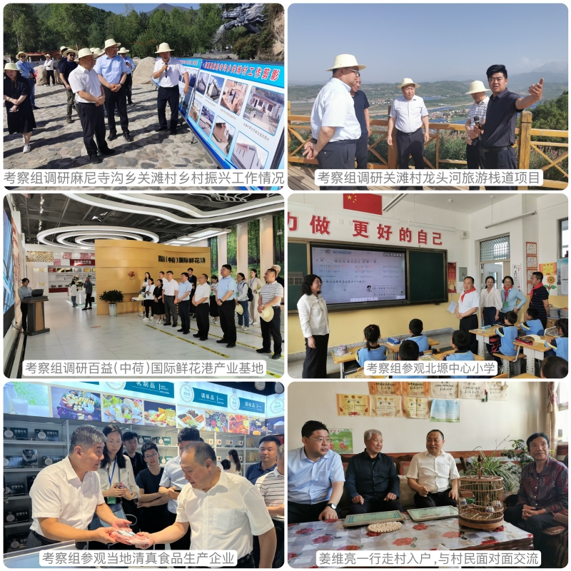 考察组一行深入对口帮扶村镇调研。姜维亮一行深入关滩村龙头河旅游栈道、南临养殖小区、百益国际鲜花港、南塬乡张河西村油桃产业等合作项目调研,前往环湖路、塬中塬、王震大军抢渡黄河纪念馆、临夏州博物馆、刁祁镇围场村、耳子屲梁等地考察文旅发展项目,参观临夏县北塬镇北塬中心小学、临夏县特殊教育学校等地。考察团详细了解学校办学、农特产品销售、帮扶项目经营等定点帮扶工作情况,认真听取临夏县乡村治理创新、人居环境提升、民生福祉改善、基础设施完善、乡风文明建设等方面情况介绍。