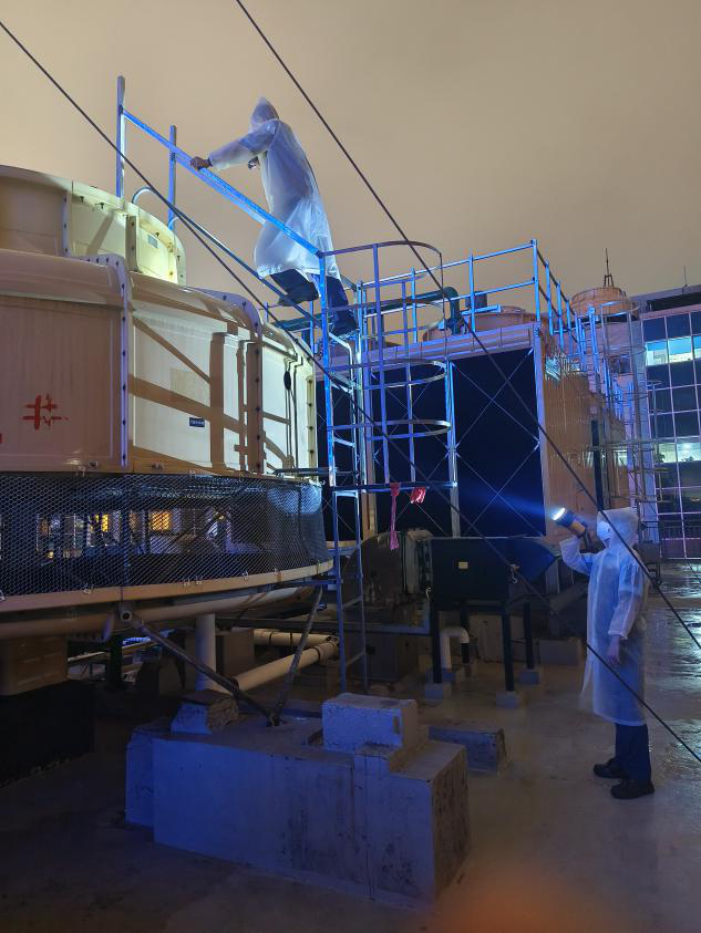 南光澳中旅帝濠酒店冒雨检查冷气散热水塔运行情况