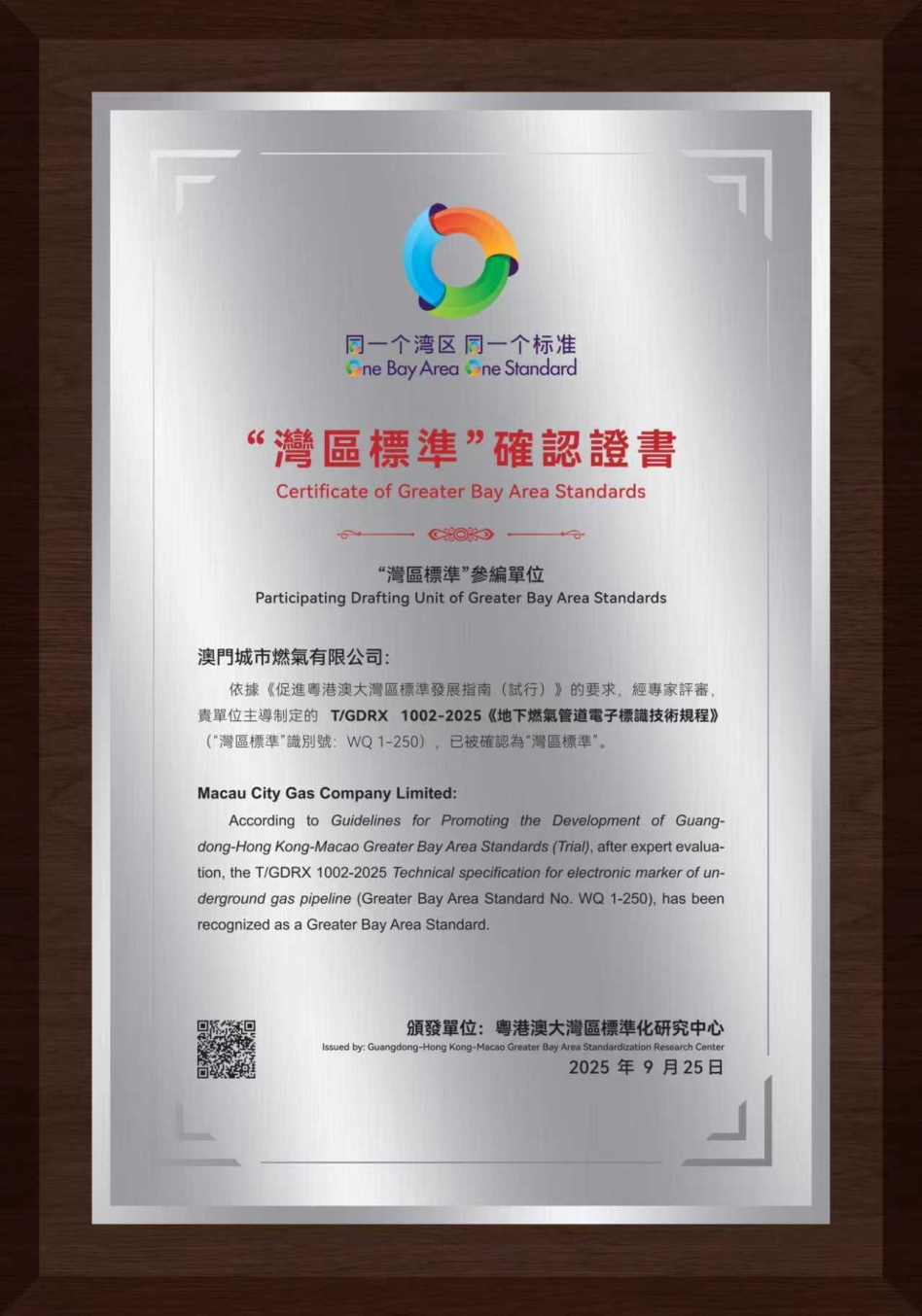 近日,由广东省燃气协会组织、澳门城燃等单位主导编制的T/GDRX 1002-2025《地下燃气管道电子标识技术规程》被粤港澳大湾区标准化研究中心确认为“湾区标准”,并于9月25日在“粤港澳大湾区标准信息公共服务平台”公布。