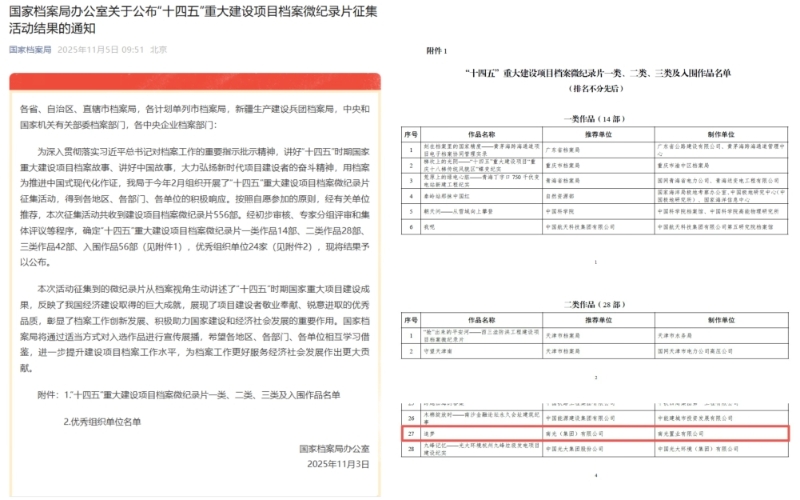 本次征集活动国家档案局共收到建设项目档案微纪录片556部。经初步审核、专家分组评审和集体评议等程序,确定“十四五”重大建设项目档案微纪录片一类作品14部、二类作品28部、三类作品42部、入围作品56部,优秀组织单位24家。此次获奖是对南光置业档案创新实践的充分肯定。未来,公司将持续推动档案工作与企业经营发展的深度融合,不断提升档案管理的系统化、专业化水平,为推动公司高质量发展提供坚实支撑与有力保障。