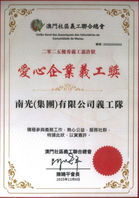 12月6日,在澳门社区义工联合总会举办的“2025优秀义工嘉许礼”活动中,南光义工队荣获“爱心企业义工奖”,南光石油黎蔚棠获颁“卓越义工奖”,南光澳中旅梁锦昌、南光置业江美娜、南光物流余秋红、南光文创王丹、南光澳巴关初九获颁“优秀义工奖”。