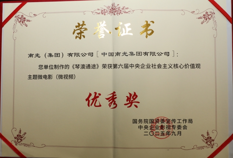 9月19日,在全国人民隆重纪念中国人民抗日战争暨世界反法西斯战争胜利80周年、喜迎新中国76周年华诞之际,由国务院国资委主办的第六届中央企业社会主义核心价值观主题微电影(微视频)展映发布活动在京举行。活动现场发布了初心使命、爱党报国、大国重器、敬业奉献、社会责任等5个主题100部优秀作品,同时揭晓中央企业基层理论宣讲100部优秀微视频。集团选送的南光置业作品《琴澳通途》荣获第六届中央企业社会主义核心价值观主题微电影(微视频)“优秀奖”,南光物流作品《助力澳门经济适度多元发展做开创琴澳融合新局面的建设者》荣获中央企业基层理论宣讲微视频“优秀奖”。