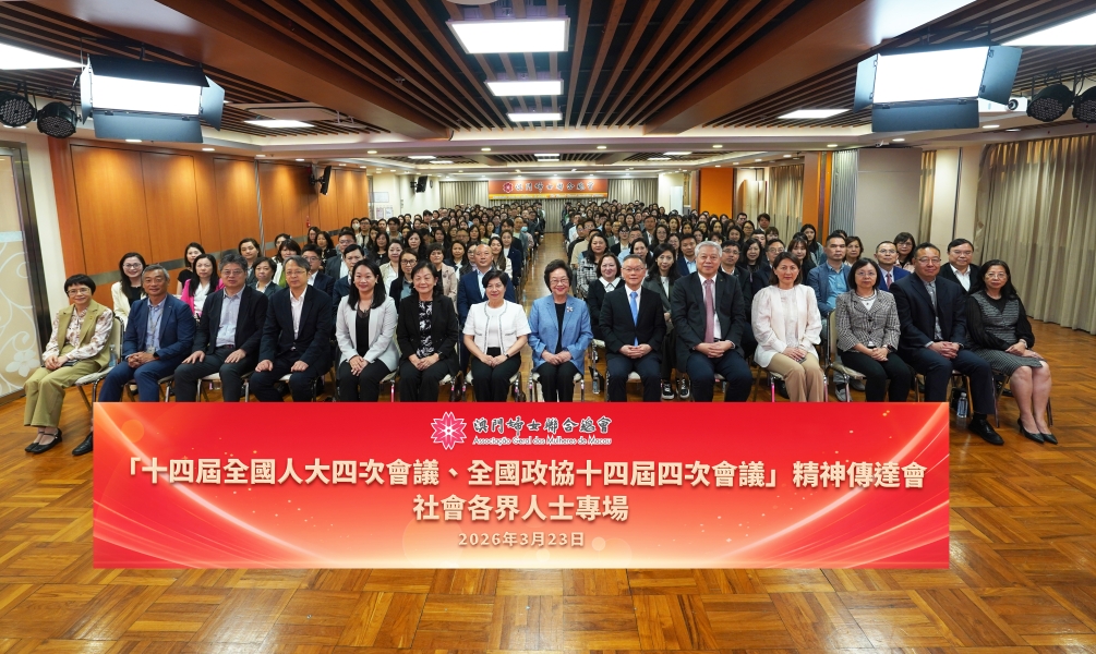 3月24日下午,由澳门妇女联合总会主办的全国两会精神传达会社会各界人士专场在妇联大厦举行。会议深入学习全国两会精神,凝聚澳门社会各界爱国爱澳共识,全国政协委员、集团董事长傅建国受邀担任主讲嘉宾,与全国人大代表崔世平、容永恩及全国政协委员黄洁贞等共同宣讲。集团董事、副总经理张沛然应邀出席活动,南光青年协会会长及理监事、各青年分会会员近40人参加学习。